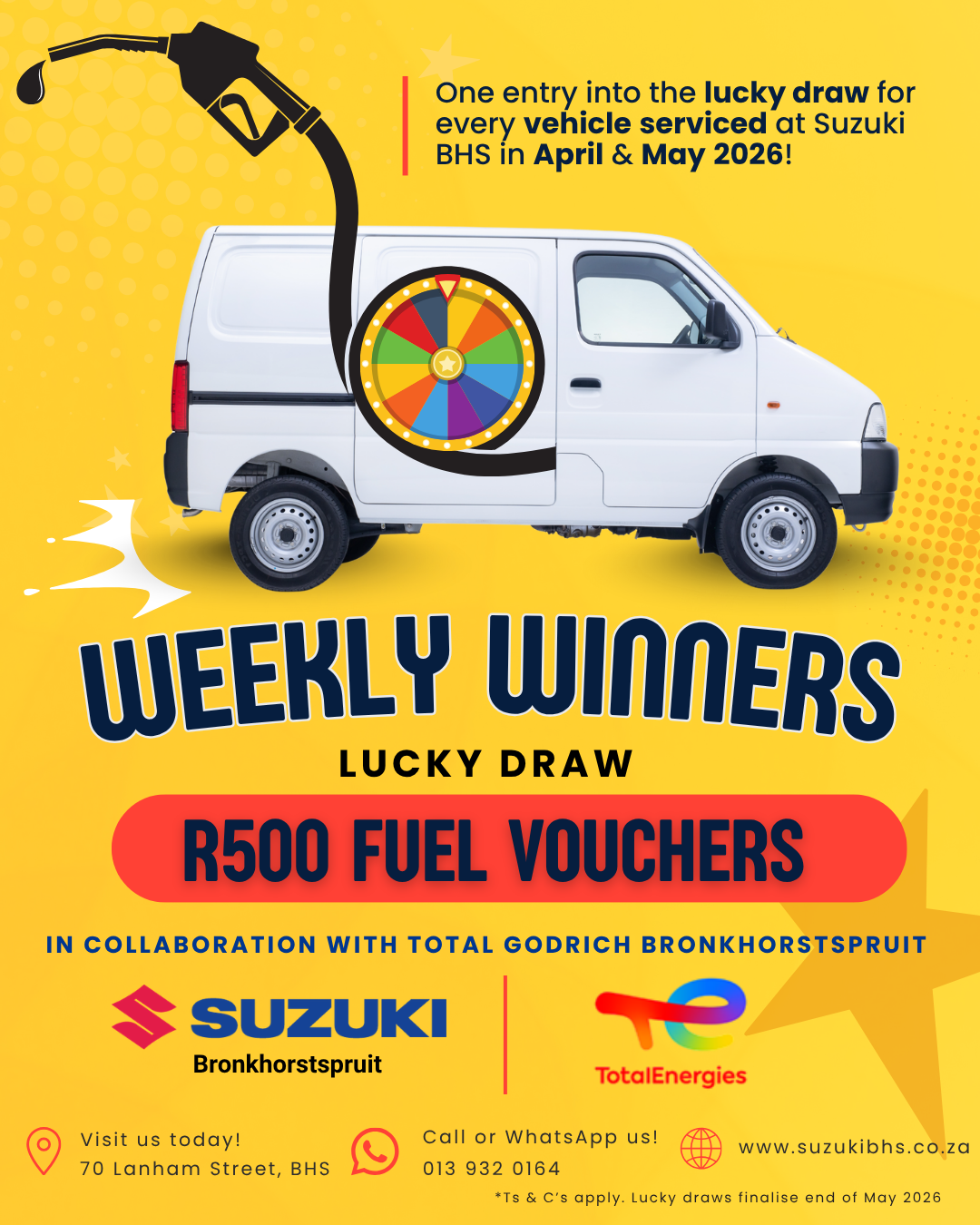 One entry into the lucky draw for every vehicle serviced at Suzuki BHS in April and May 2026 |
